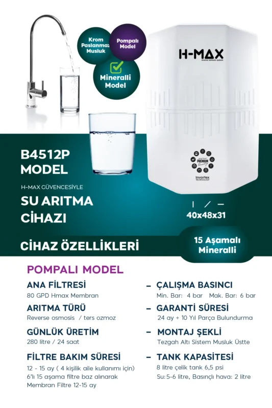 12 Litre Pompalı 15 Aşama Multi Mineralli 80 GPD Su Arıtma Cihazı HMAXS4512P