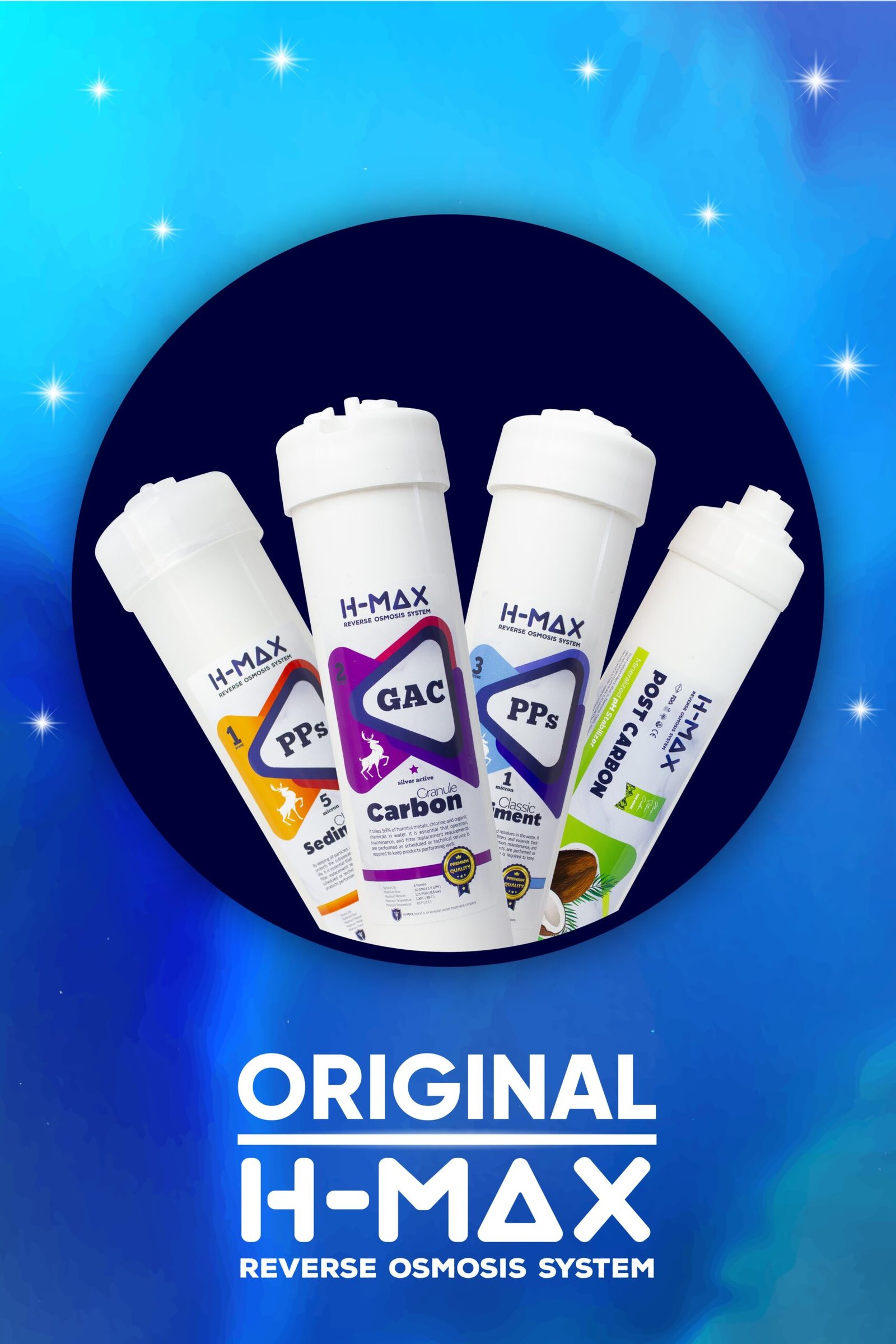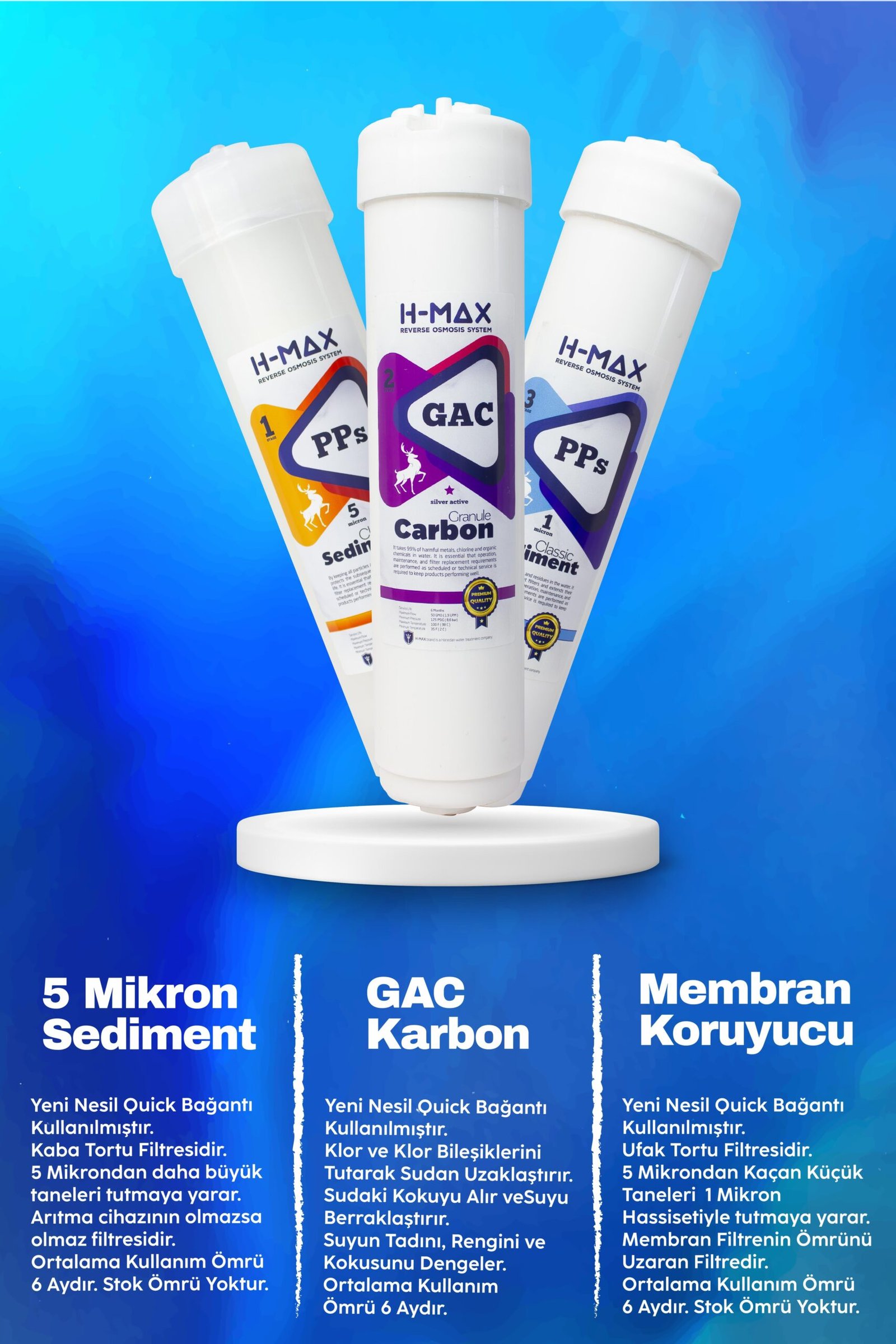 H-MAX İnline 3’lü filtre, H-MAX Post Carbon, Multimineral Filtre, Alkali Filtre, HMAX 75 GPD Membran ve gerekli tüm bağlantı parçalarını içerir.